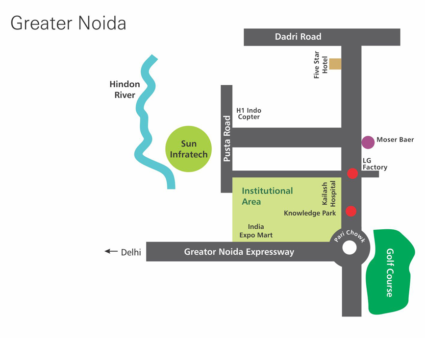 Our site is just 0 km away from Greater Noida Knowledge park and lies on the side of pustha which join Noida Expressway & Dadri road. As shown in the map it is at the bank of Hindon river & lies in the close proximity of Knowledge Park 3 of Greater Noida.